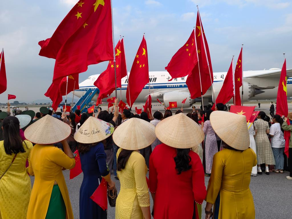 離開河內(nèi)赴機場途中,當?shù)孛癖姾腿A僑華人聚集在道路兩旁,揮舞中越兩國國旗,熱烈歡送習(xí)近平總書記,并祝賀訪問取得圓滿成功。