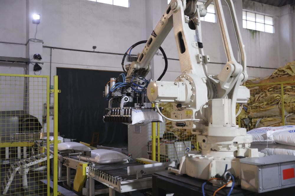 12月14日,在廣西來賓東糖鳳凰有限公司,機械臂在廠房碼放白砂糖成品。