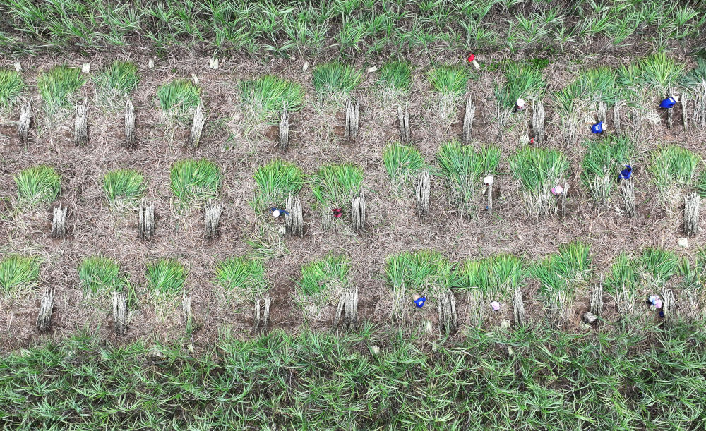 12月12日,在來賓市興賓區(qū)小平陽鎮(zhèn),農(nóng)民在收割甘蔗(無人機照片)。