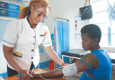 穆薩烏(左)為一名當地孕婦測量血壓。