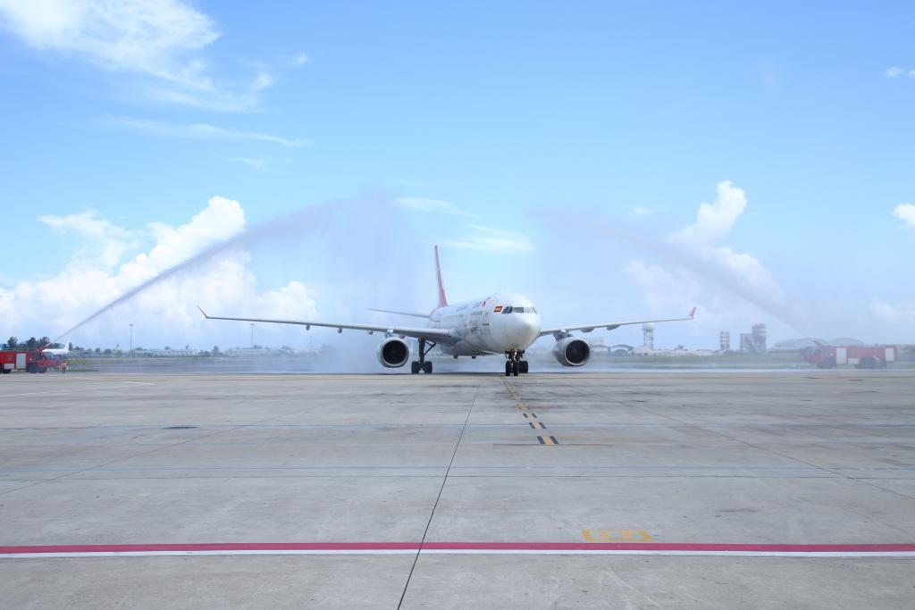 ??2023年1月18日,中國首都航空J(rèn)D455航班在馬爾代夫馬累維拉納國際機(jī)場接受水門禮。