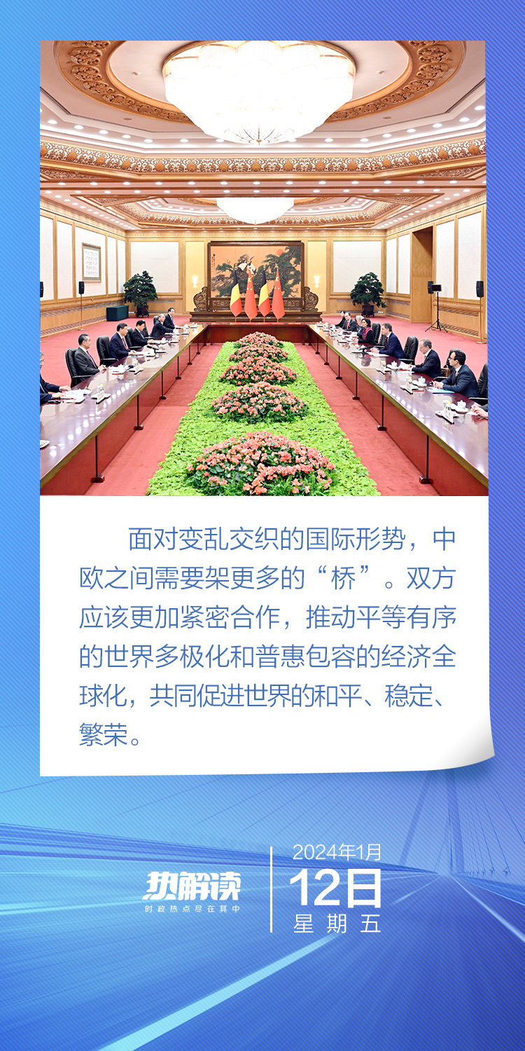 新年伊始,國際形勢變亂交織。具有戰(zhàn)略意義和世界影響的中歐關(guān)系,關(guān)乎世界和平、穩(wěn)定、繁榮。中歐應(yīng)該更加緊密合作,共同架設(shè)更多的“橋”,為世界提供更多穩(wěn)定性,為發(fā)展提供更多推動力。