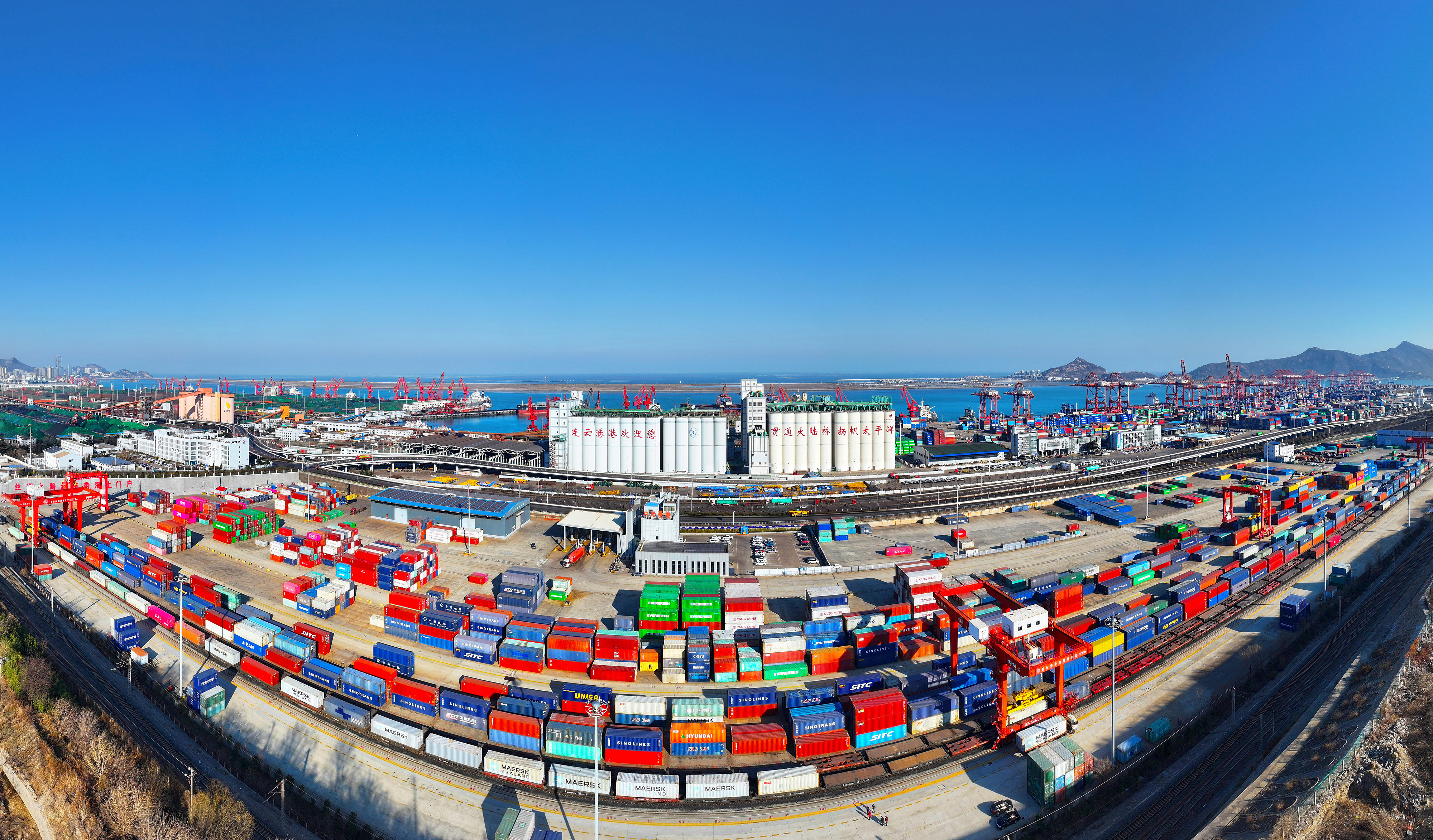 2024年1月10日,江蘇省連云港市,大型機(jī)械正在裝運(yùn)集裝箱貨柜。