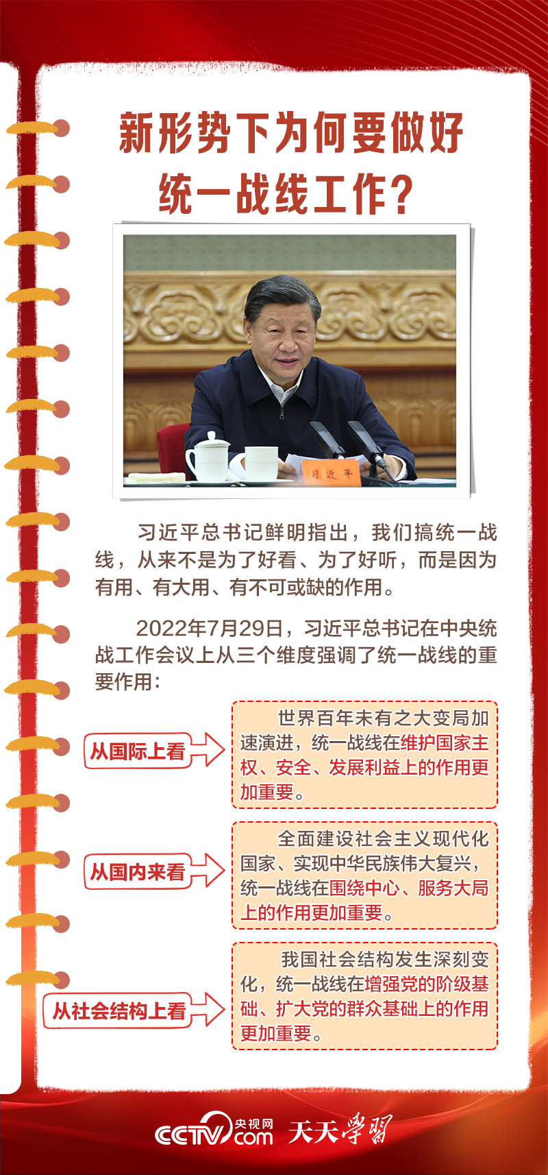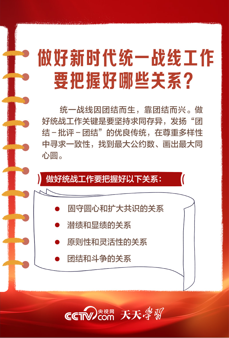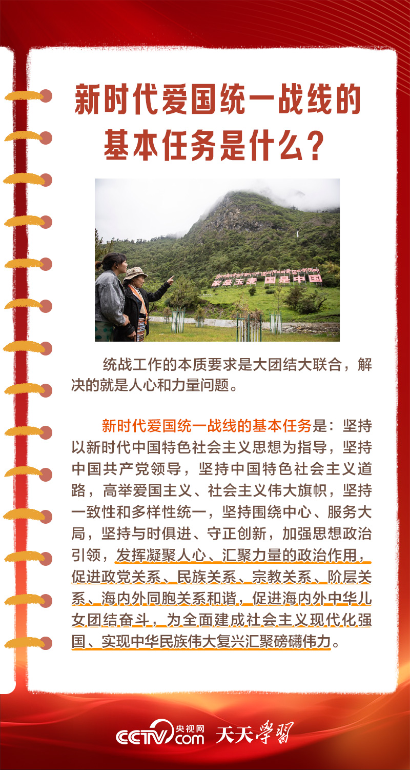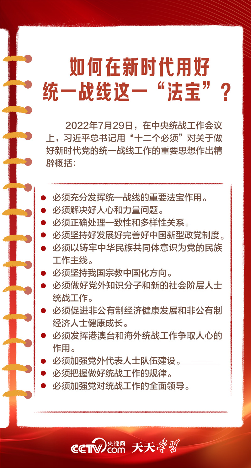 天天學(xué)習(xí)1月16日出版的第2期《求是》雜志發(fā)表了習(xí)近平總書記的重要文章《完整、準(zhǔn)確、全面貫徹落實(shí)關(guān)于做好新時(shí)代黨的統(tǒng)一戰(zhàn)線工作的重要思想》,該文是習(xí)近平總書記2022年7月在中央統(tǒng)戰(zhàn)工作會(huì)議上講話的一部分。文章指出,統(tǒng)一戰(zhàn)線是黨克敵制勝、執(zhí)政興國(guó)的重要法寶,是團(tuán)結(jié)海內(nèi)外全體中華兒女實(shí)現(xiàn)中華民族偉大復(fù)興的重要法寶,必須長(zhǎng)期堅(jiān)持。