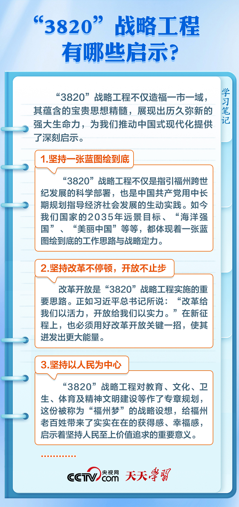 天天學習上世紀90年代,習近平在福州工作期間,親自主持編制了《福州市20年經(jīng)濟社會發(fā)展戰(zhàn)略設(shè)想》(簡稱“3820”戰(zhàn)略工程),系統(tǒng)謀劃了福州3年、8年、20年經(jīng)濟社會發(fā)展的目標、步驟、布局、重點等,為福州擘畫了美好藍圖,確立了總綱領(lǐng)、總方略。
