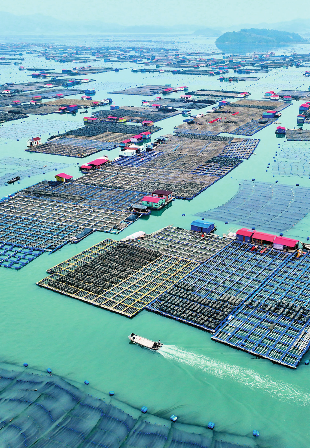 ??晨光灑在海面,萬頃碧波間,一列列網(wǎng)箱如同阡陌縱橫的海上農(nóng)田,色澤金黃的大黃魚悠然歡游,穿梭其間的漁民們徜徉在“金黃色的美夢”中。