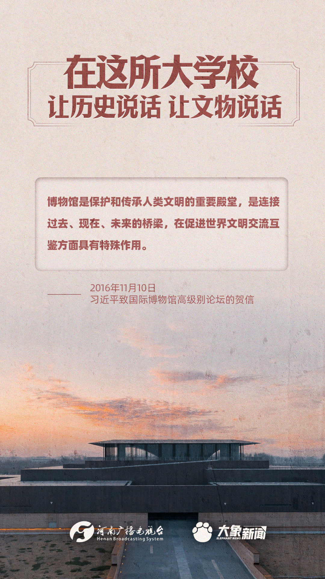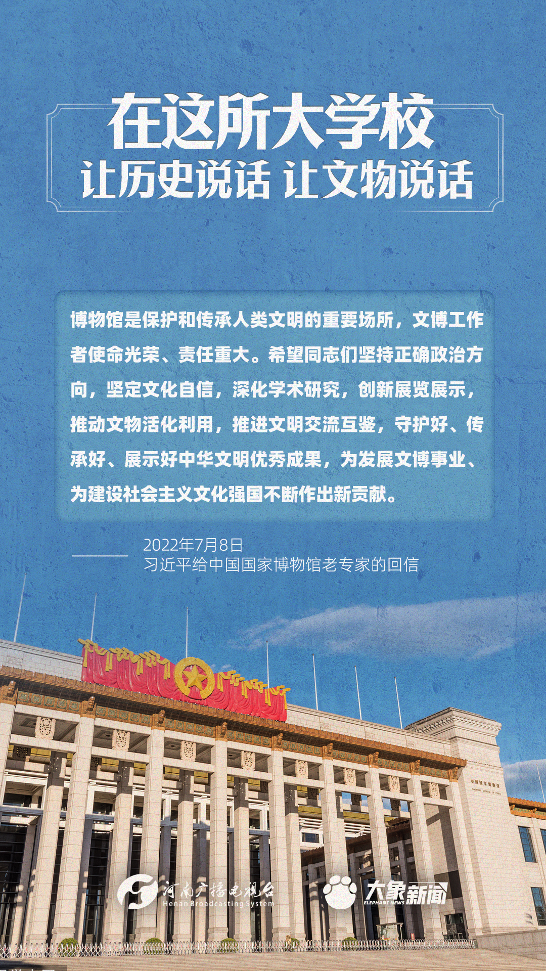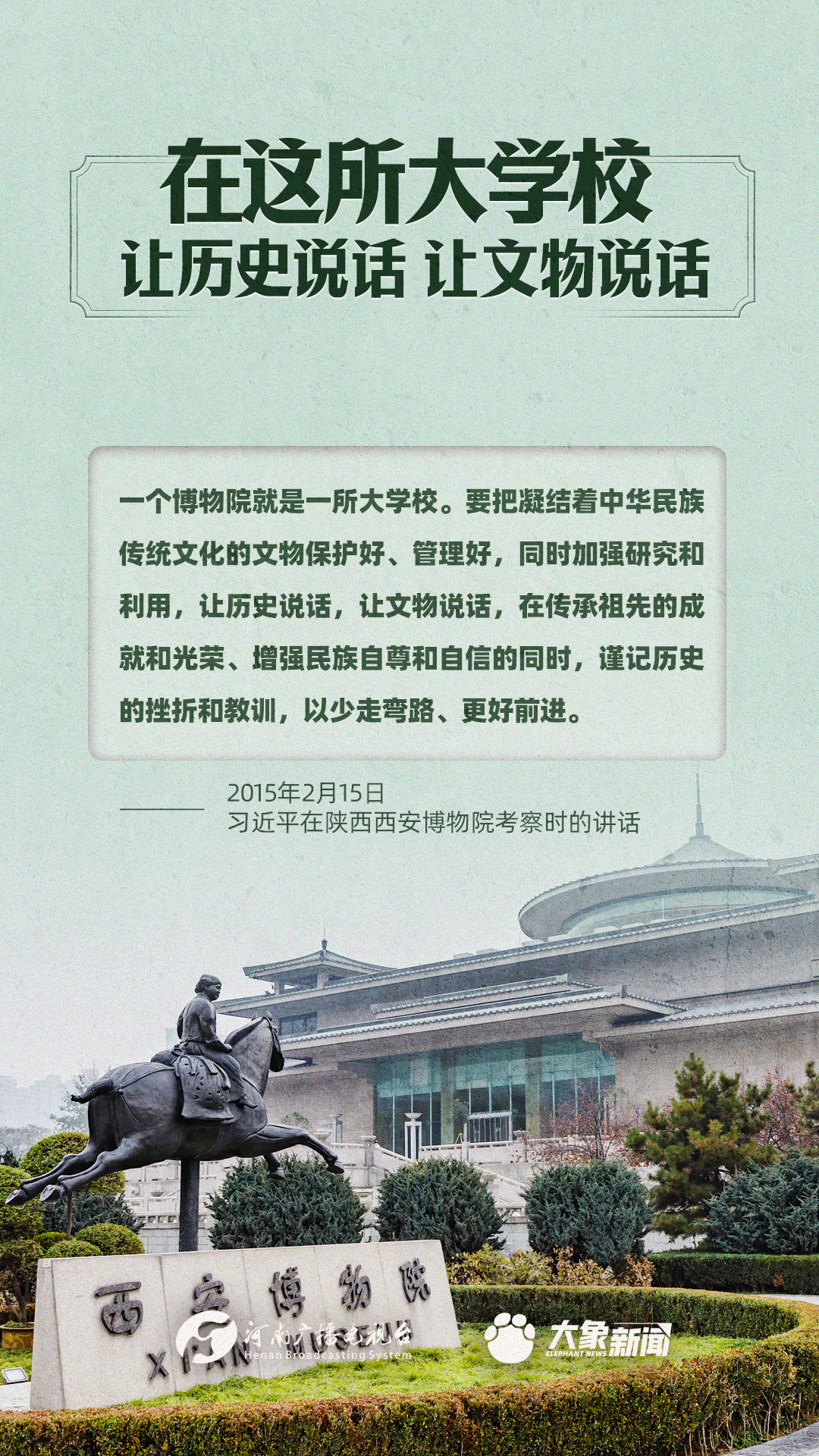 習(xí)近平總書記一直高度重視博物館工作,多次作出重要講話,強(qiáng)調(diào)“一個博物院就是一所大學(xué)校”,指出“讓歷史說話,讓文物說話”,要求“守護(hù)好、傳承好、展示好中華文明優(yōu)秀成果”等等,金句連連。大象新聞進(jìn)行了認(rèn)真梳理,邀您一起學(xué)習(xí)。