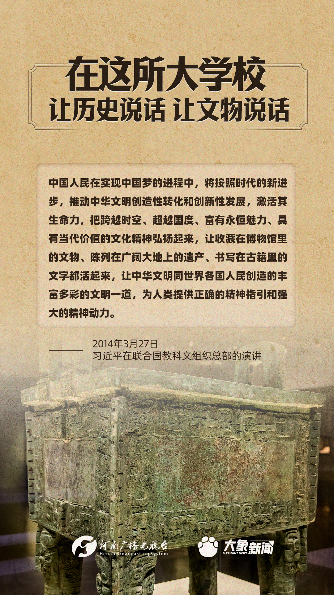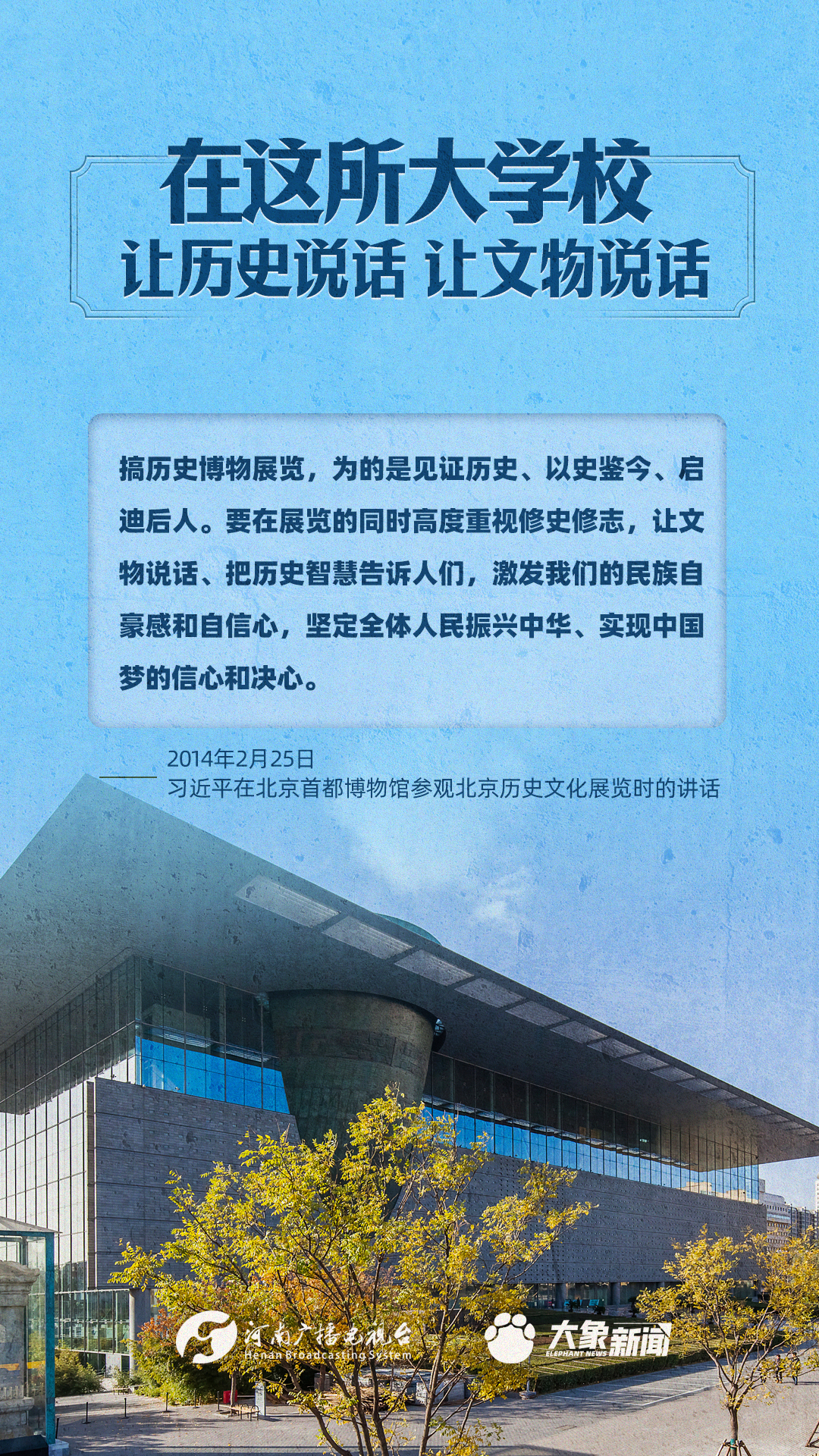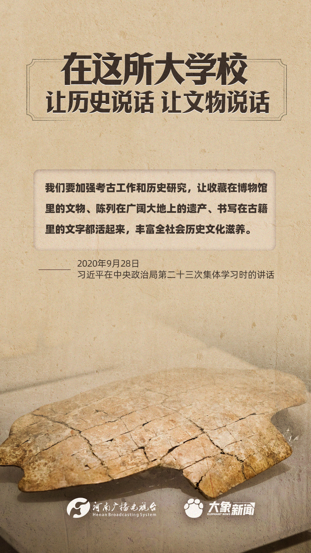 習(xí)近平總書記一直高度重視博物館工作,多次作出重要講話,強(qiáng)調(diào)“一個博物院就是一所大學(xué)校”,指出“讓歷史說話,讓文物說話”,要求“守護(hù)好、傳承好、展示好中華文明優(yōu)秀成果”等等,金句連連。大象新聞進(jìn)行了認(rèn)真梳理,邀您一起學(xué)習(xí)。