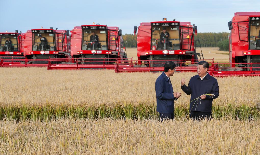 2018年9月25日,金秋時節(jié),稻浪滾滾,黑龍江農(nóng)墾建三江管理局七星農(nóng)場萬畝大地號豐收在望。習(xí)近平總書記走進正在收割的地塊,拿著稻穗,同工作人員交談,詳細了解糧食生產(chǎn)和收獲情況。