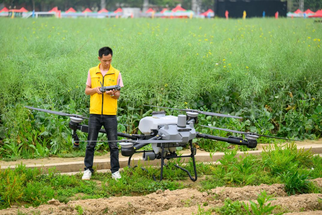 △ 2024年3月18日,廣東省東莞市石碣鎮(zhèn)掀起春耕生產(chǎn)熱潮。圖為一名工作人員正在操作無(wú)人機(jī)。