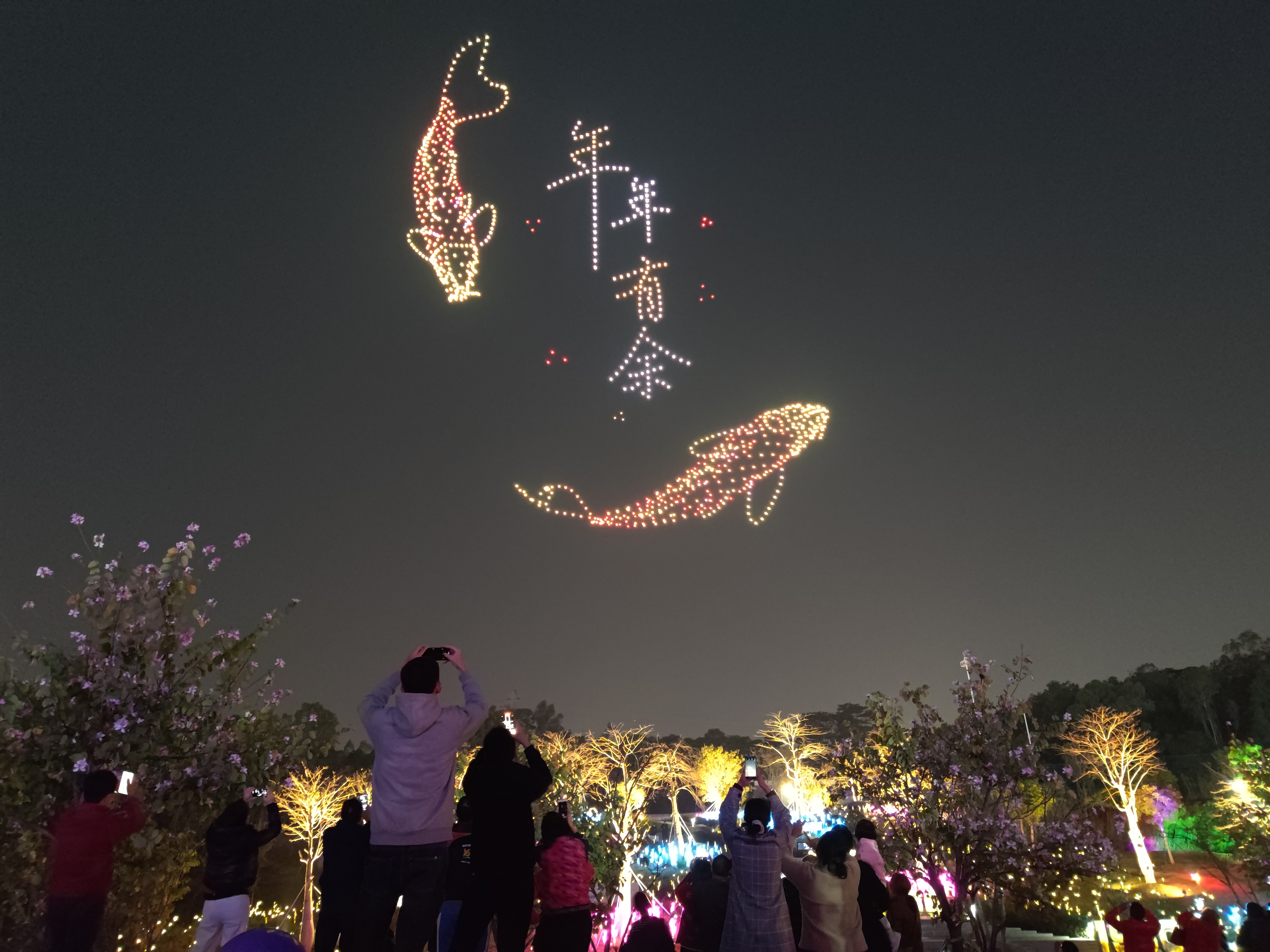 △ 2024年2月10日,深圳北站中心公園,春節(jié)主題無人機燈光秀引來眾多游客駐足觀看。
