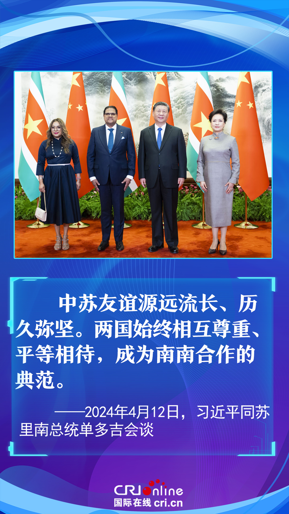 今年是中國和蘇里南建立戰(zhàn)略合作伙伴關(guān)系五周年。習(xí)近平主席在會談中以“源遠(yuǎn)流長、歷久彌堅”為中蘇友誼增添了新的注解,為推動構(gòu)建更加緊密的中蘇戰(zhàn)略合作伙伴關(guān)系指明了方向。