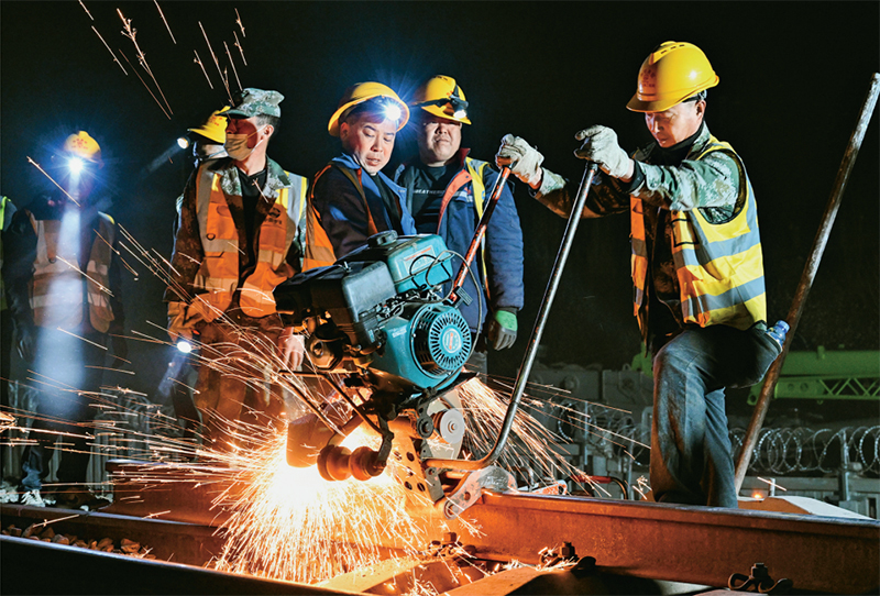2024年4月10日,在內(nèi)蒙古包頭市,包銀高鐵引入包頭樞紐工程的關(guān)鍵控制性工程之一——包西上行線路撥接完成施工。此次施工完成,標(biāo)志著包銀高鐵引入包頭樞紐包頭站改造工程取得重大進(jìn)展,為包銀高鐵開通奠定堅實基礎(chǔ)。圖為4月10日凌晨,工人在包西上行線路上作業(yè)。 新華社記者 劉磊/攝