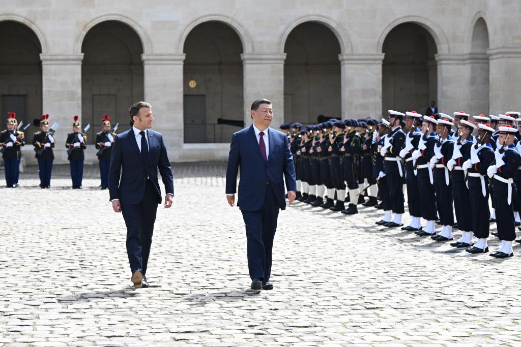 ??當(dāng)天下午,習(xí)近平在巴黎出席馬克龍舉行的隆重盛大歡迎儀式。兩國元首檢閱法蘭西共和國衛(wèi)隊和陸海空三軍儀仗隊,并觀看分列式。