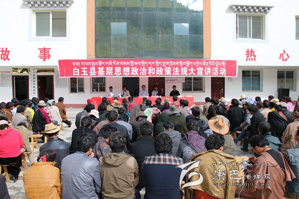 ?。冈碌陌子?,烈日當(dāng)頭,秋高氣爽。31日上午,絨蓋鄉(xiāng)政府大院內(nèi),白玉縣基層思想政治和政策法規(guī)大宣講活動(dòng)正在這里精彩“上演”,400多名前來“聽課”的各村群眾正津津有味地品味著縣宣講團(tuán)成員松吉尼瑪通俗易懂的藏語(yǔ)大宣講。從黨的十八大到十八屆三中全會(huì)精神,從糧食直補(bǔ)到低保、新農(nóng)保,從養(yǎng)老保險(xiǎn)、殘疾人幫扶到相關(guān)法律法規(guī),宣講者深入淺出,傾聽者全神貫注。