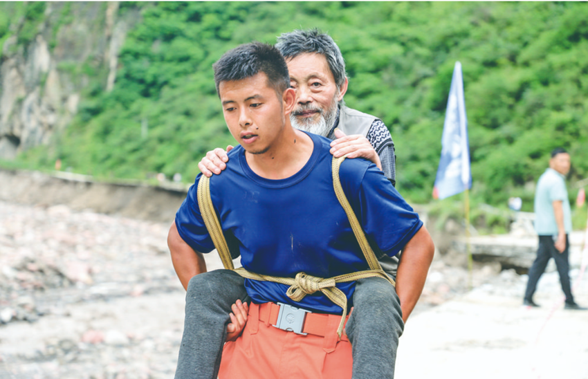 鹽水溪村71歲的村民倪月富,腰以下重度殘疾,行動極為不便,被困家中。關(guān)鍵時(shí)刻,村組干部及時(shí)前來轉(zhuǎn)移。由于轉(zhuǎn)移路線漫長,且沿途存在垮塌狀況,村黨員干部接力背送老人。