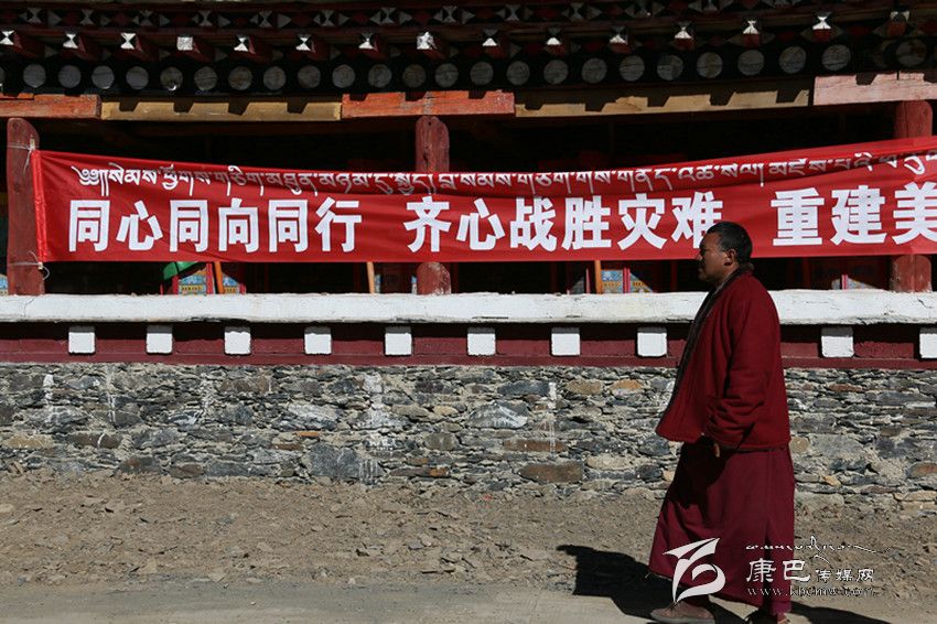 記者注意到,在金龍寺大門處的圍墻上貼著一面寫有“同心同向,共渡難關(guān),重建家園”的紅色橫幅,一位僧人口中念念有詞,走過橫幅,向新搭建的救災(zāi)帳篷走去,另一位僧人則拿著一柄鋤頭走出寺院大門,隨同另一批救災(zāi)人員去處理前幾日垮塌在地的石頭。