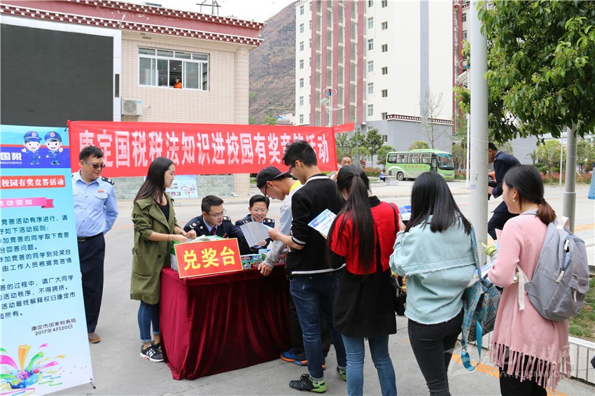本網(wǎng)訊(吳海波 記者 張嗥)購(gòu)物時(shí)商家不給發(fā)票,可以打哪個(gè)電話(huà)進(jìn)行投訴?增值稅納稅人分為哪幾類(lèi)?”這一系列與生活息息相關(guān)的稅法知識(shí)有獎(jiǎng)答題,引來(lái)了眾多四川民族學(xué)院同學(xué)的熱情參與。4月20 日,康定市稅法宣傳月活動(dòng)持續(xù)升溫,稅法宣傳首次走進(jìn)高等院校。