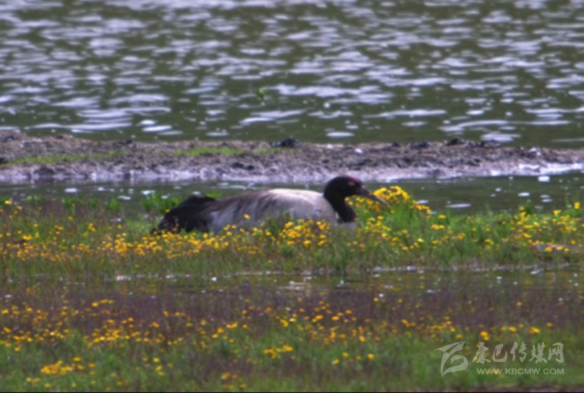 黑頸鶴是唯一生長(zhǎng)繁殖在高原的鶴類,國(guó)家一級(jí)保護(hù)動(dòng)物,冬季10月左右遷往云貴高原等低緯度地區(qū),2月下旬陸續(xù)返遷回到高原,到達(dá)白玉縣保護(hù)區(qū)時(shí)間一般在4月下旬。這次黑頸鶴繁殖巢穴位于麥拉降措湖邊一塊四面環(huán)水的平臺(tái)上,鮮花盛開,相對(duì)隱秘。