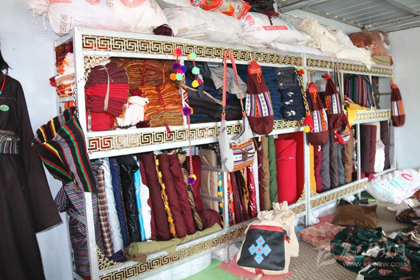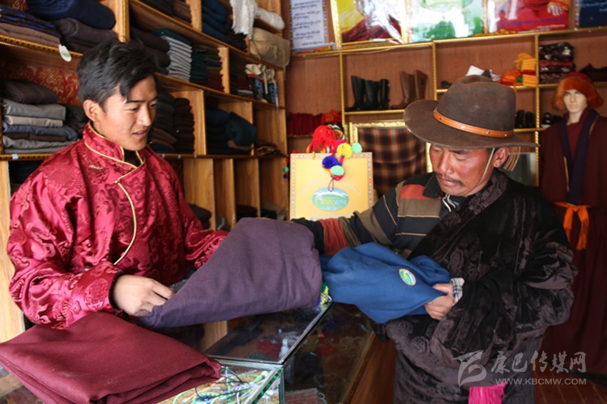 安孜鄉(xiāng)作為白玉縣海拔較高的鄉(xiāng)鎮(zhèn)之一,夏天是十分短暫的,連日來的晴好天氣,也透著絲絲寒氣。牧民阿剛想要量身定做一套過冬的藏裝,8月26日,他來到白玉縣阿察鎮(zhèn),一家民族服飾商貿(mào)公司吸引了他的目光?!拔覀冞@里的服裝面料是本地羊毛和從浙江進(jìn)的上等面料,做工考究,很多工序是純手工制作,服裝樣式你可以根據(jù)你的喜好指定,我們包你滿意?!钡陠T仁真熱情地介紹。聽了仁真的介紹,阿剛用手捻了一下服裝用料的質(zhì)地,看到印有“祥陽措”商標(biāo)的精美包裝袋,商店里擺放的五彩斑斕、高端大氣的藏式男女服裝,他有些動(dòng)心了?!吧a(chǎn)這些服裝的都是我們納塔鄉(xiāng)的牧民,你可以考察我們的服裝用料、生產(chǎn)流程,再作打算。”仁真熱情洋溢地介紹說。