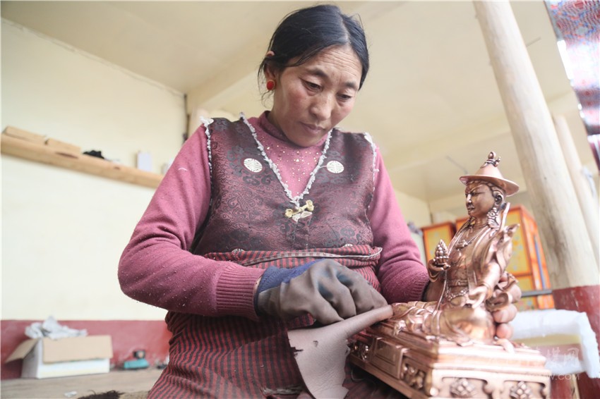 一雙粗糙而靈巧的手正一絲不茍地對(duì)銅像進(jìn)行最后的打磨。這是一雙執(zhí)著于銅鑄工藝43年的手。尼瑪從7歲開(kāi)始學(xué)習(xí)銅鑄手藝,是該項(xiàng)工藝的州級(jí)非物質(zhì)文化傳承人。