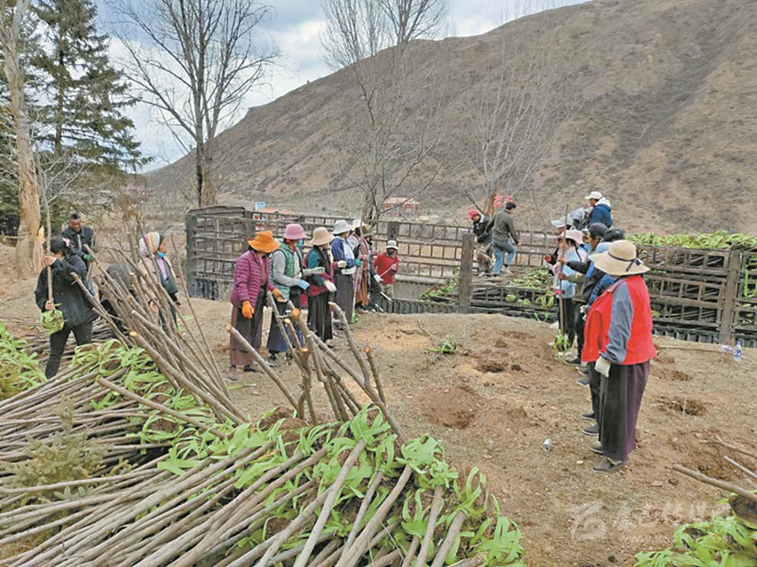 爐霍縣斯木俄米脫貧攻堅造林專合社組織村民下苗,準備栽種。 爐霍縣林草局 供圖