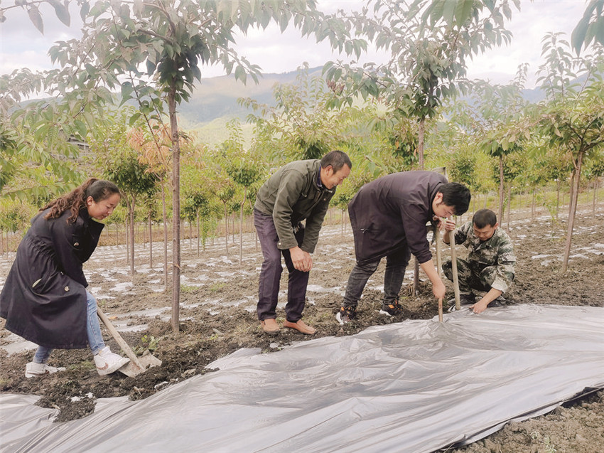 “大家記到哈,土地要平整,地膜要平整覆蓋,每一行只種4棵?!甭櫳昝鞒吨ぷ訉φ诜N植芍藥的村民說。