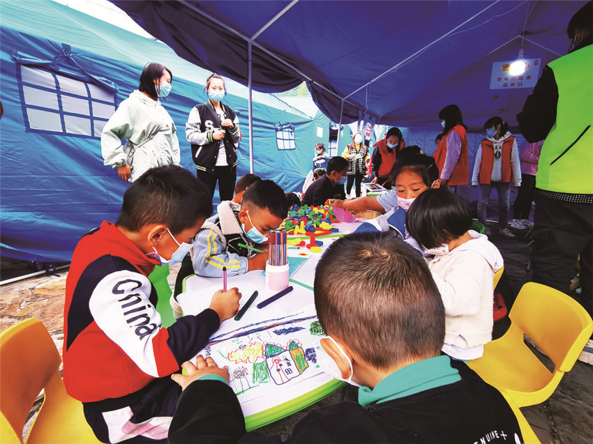 “這頂帳篷中充滿了孩子們的歡聲笑語,這在地震災(zāi)區(qū)就是最動(dòng)聽的聲音?!惫睬鄨F(tuán)甘孜州委統(tǒng)戰(zhàn)社會(huì)聯(lián)絡(luò)部部長澤仁娜姆介紹,地震發(fā)生后,團(tuán)州委第一時(shí)間組織3193名志愿者,24支青年突擊隊(duì)參與應(yīng)急志愿者工作,并在磨西鎮(zhèn)貢嘎廣場(chǎng)分配38名志愿者參與后勤保障工作,其中5個(gè)人便成為了“青青兒童樂園”里的“保育員”,“孩子們可以在這里畫畫、做游戲,還能在老師輔導(dǎo)下學(xué)習(xí),他們不安的情緒也得到安撫,臉上的恐懼也逐漸被微笑取代。”