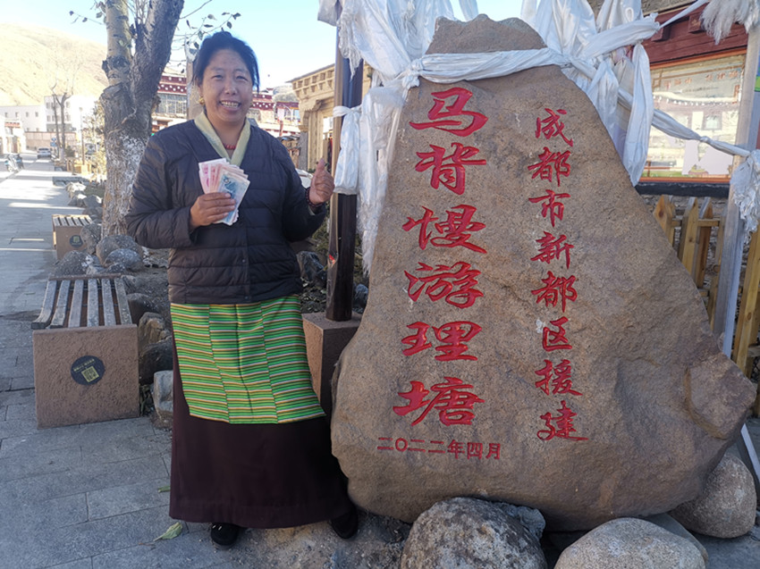四郎卓瑪在現(xiàn)金分紅后在項(xiàng)目石刻前留影。