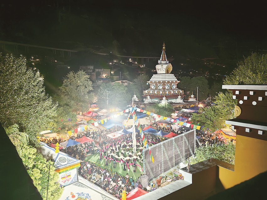 悠揚的藏戲唱腔,體現(xiàn)了非物質(zhì)文化遺產(chǎn)的源遠(yuǎn)流長,三地的藏戲文化交流,碰撞出了民族文化的璀璨火花。表演中,演員們使用的面具生動傳神,服飾華麗多彩,充分展現(xiàn)出了藏戲藝術(shù)的獨特魅力。圍坐在舞臺周圍的觀眾紛紛被劇情深深吸引,進(jìn)入藏戲的世界癡迷沉醉?!啊肜展?jié)’是巴塘的傳統(tǒng)節(jié)日,對巴塘人來說意義重大,在‘央勒節(jié)’上看藏戲更是必不可少的。我是一個藏戲迷,從白天的開幕式演出,到晚上的藏戲?qū)鲅莩觯粋€個精彩的節(jié)目,讓來自八方的游客感受到‘央勒節(jié)’濃厚的節(jié)日氛圍和非遺藏戲的魅力,也歡迎廣大游客來巴塘和我們一起在現(xiàn)場體驗和感受?!庇^眾赤乃說。