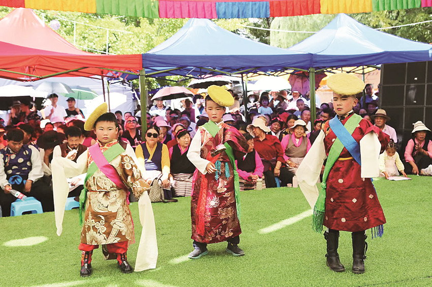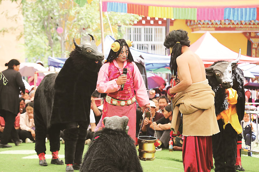 巴塘藏戲團(tuán)帶來了藏戲《智美更登》中“牧人”的唱腔片段,劇情中贊頌家鄉(xiāng)水草豐美,牛羊滿倉的美好景象與九月豐收的巴塘美景相應(yīng)相合。