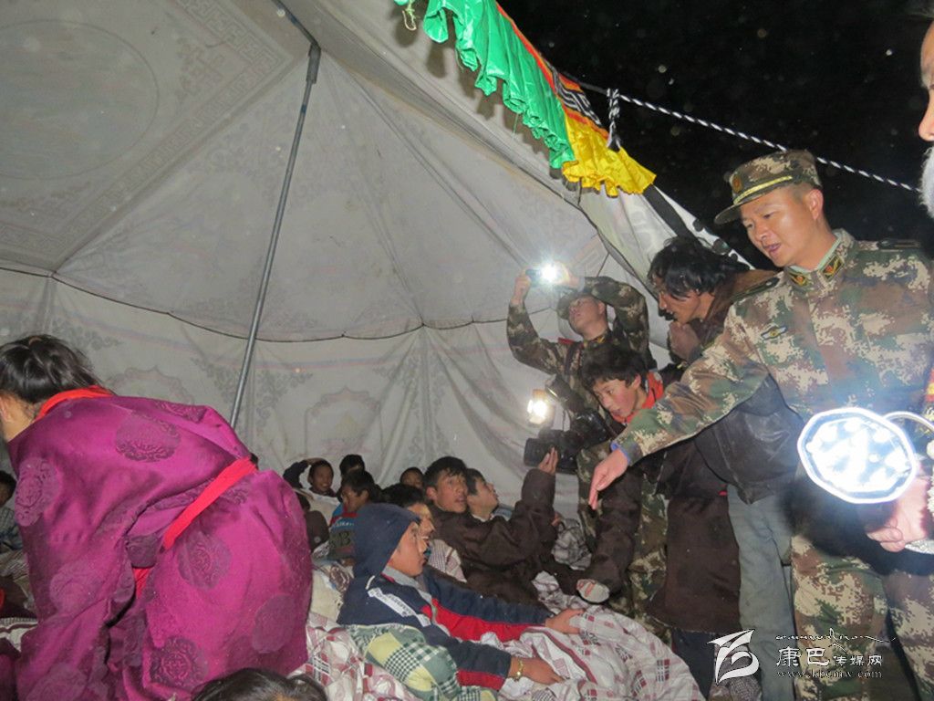 23日凌晨2時許,當木雅祖慶學校安置點所有師生和群眾入住帳篷后,官兵們開始為85頂帳篷里的群眾逐一發(fā)放棉衣、棉被等救災(zāi)物資。“我不想住這里!我要回家,這里會垮掉……”15歲的八年級學生索讓還未從地震陰影中走出來,驚魂未定的他不聽老師和同學們的勸告,執(zhí)意要“逃離”安置點。高俊帶領(lǐng)軍醫(yī)及時趕來安撫索讓,“有武警叔叔在,不怕……”高俊摟著索讓的肩耐心地安撫著,當他輕撫其額頭時發(fā)現(xiàn)索讓有些發(fā)燒,便立即安排軍醫(yī)為其服藥并物理退燒,直到其安然入睡才悄悄離去。