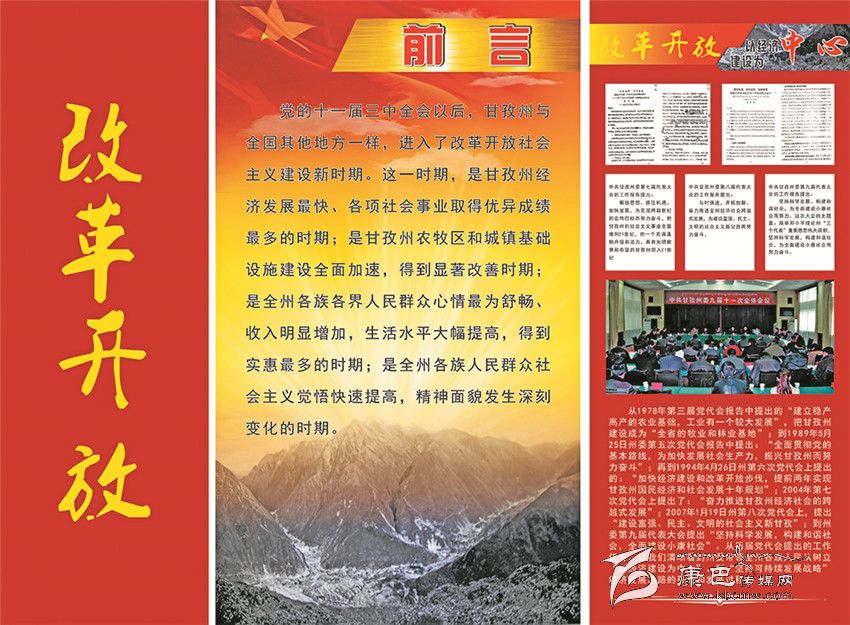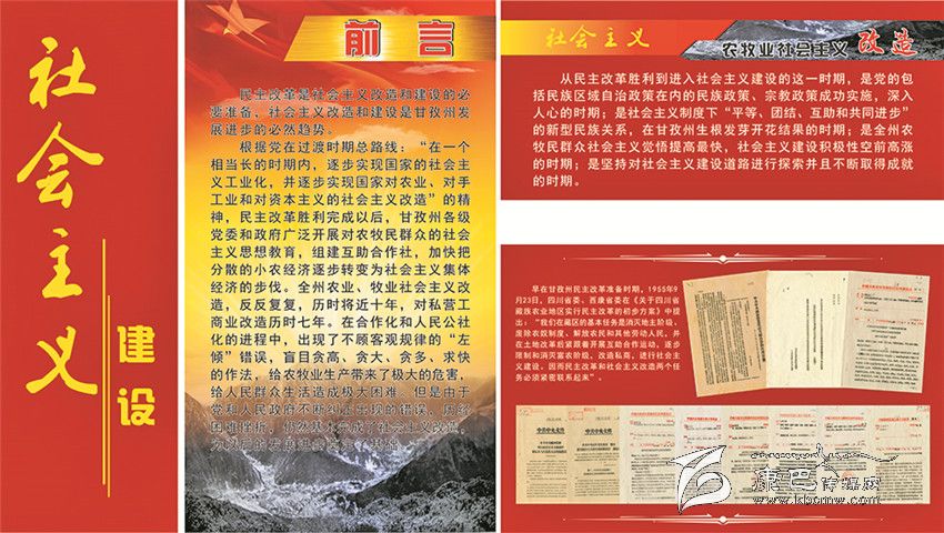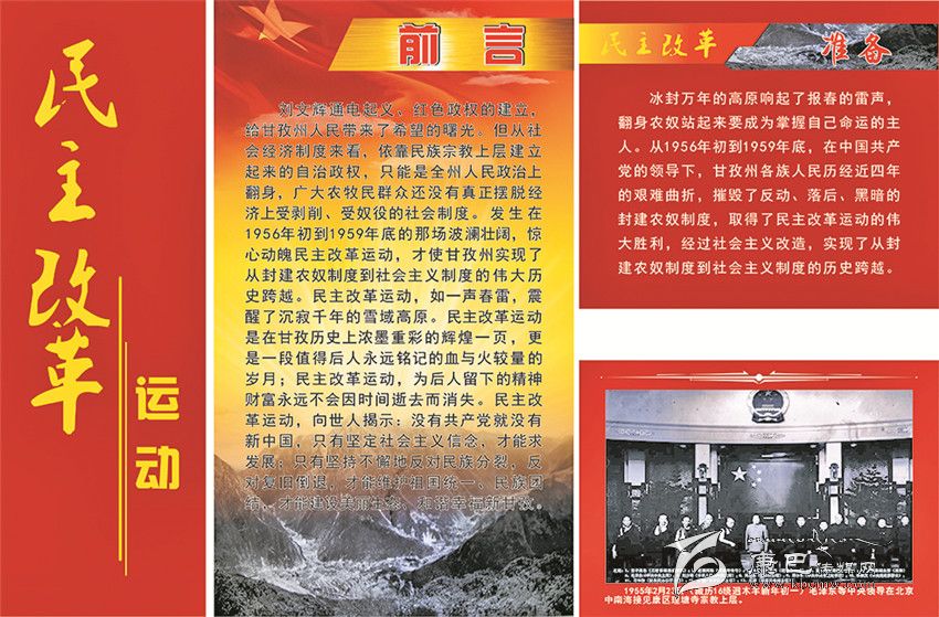 《甘孜州檔案館愛國主義教育基地》的整個(gè)展覽分為四大板塊。第一部分命名為“自治政權(quán)的建立”,向參觀者介紹了甘孜藏族自治州誕生的歷史過程;第二部分是“民主改革運(yùn)動(dòng)”,把人們帶回了那段不能忘記的烽火歲月;第三部分是“社會主義建設(shè)”,深情地回顧了在建設(shè)社會主義事業(yè)中我州所取得的不平凡的成就;第四部分是“改革開放”,讓人們重溫了在改革開放的大潮中所經(jīng)歷的那些充滿激情的經(jīng)歷。