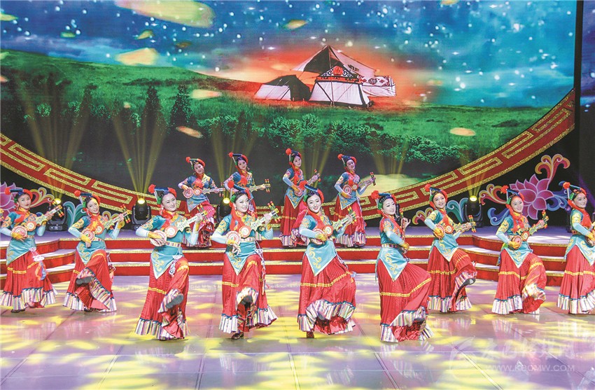 在團(tuán)拜會節(jié)目演出環(huán)節(jié),隨著主持人一句“柳綠枝頭待燕歸,金雞賀歲開門紅”脫口而出,20余名活潑、歡快的少年涌上舞臺,就著音樂的節(jié)拍,揮手踏足、左挪右轉(zhuǎn),翩翩起舞;少年們舞動的長袖映著縷縷斑斕的光束,依如雄鷹在拍打著飛翔的翅膀。這便是此次演出的開場節(jié)目《雛鷹飛翔》,一場絢麗多彩的“甘孜春晚”由此火熱開演。隨后,一群體態(tài)輕盈、妝如仙鶴的女子用靈動的舞姿為甘孜祈福,點明了此次團(tuán)拜會的一大主旨——祝福甘孜。
