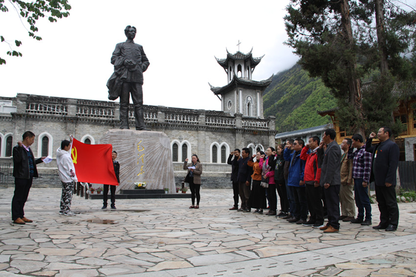 本網(wǎng)訊 (本網(wǎng)記者 秦松 攝影報(bào)道)日前,甘孜日?qǐng)?bào)社全體黨員與群眾工作全覆蓋結(jié)對(duì)共建共創(chuàng)的海螺溝燕子溝鎮(zhèn)的躍進(jìn)坪村支部、南門(mén)關(guān)村支部、麻柳林村支部、喇嘛溝村支部的黨員,懷著崇敬的心情來(lái)到磨西長(zhǎng)征紀(jì)念館毛主席塑像前,舉行緬懷革命先烈、重溫入黨誓詞活動(dòng)?;顒?dòng)中,黨員們還與共建共創(chuàng)支部黨員進(jìn)行了座談。圖為宣誓活動(dòng)現(xiàn)場(chǎng)。