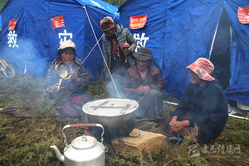 曲珍、曲西和幾個(gè)伙伴正在燒著開水。“這是到安置點(diǎn)后我第一次生火。前兩天吃干糧喝礦泉水,讓喝慣了酥油茶的我們很不適應(yīng)?!鼻湔f。