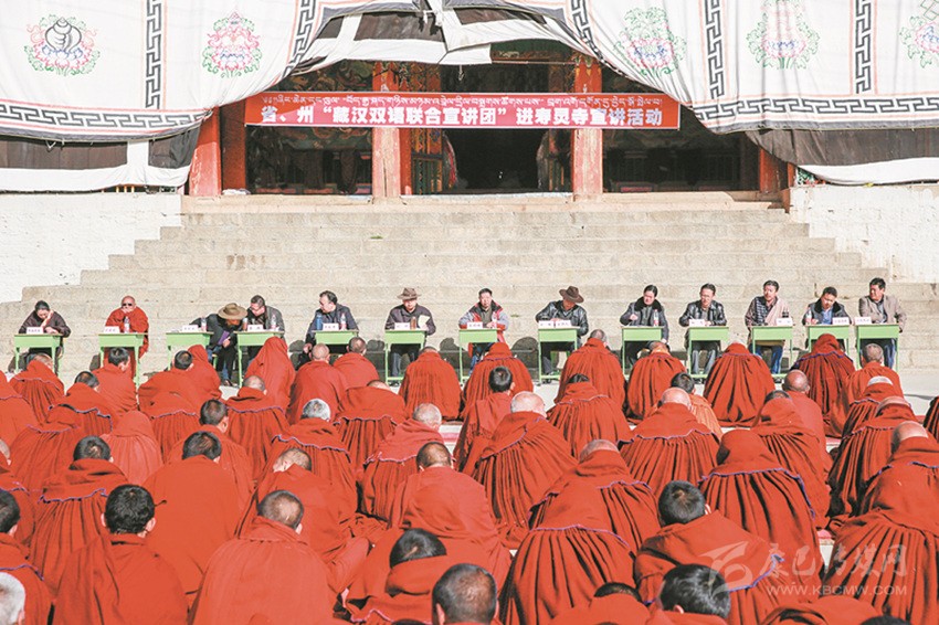 在法律進寺廟方面,我州持續(xù)深化法律進寺廟“四進七有”活動,健全完善寺廟法治宣傳欄、法律圖書角、法律服務聯系點、法律明白人管理等工作制度,建成寺廟法治宣傳欄598個、圖書角504個、法律服務聯系點489個,培訓培養(yǎng)寺廟“法律明白人”947人;組織開展《憲法》《刑法》《刑事訴訟法》《國家安全法》《治安管理處罰法》《道路交通安全法》《宗教事務條例》進寺廟專項活動,全州共開展法律入寺宣傳1900余場次,覆蓋寺廟532座、僧尼8萬余人次。