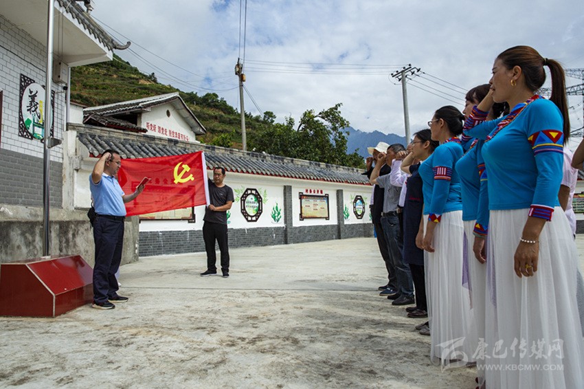 在建黨98周年來臨之際,王昇帶領(lǐng)全村共產(chǎn)黨員、入黨積極分子和幫扶單位瀘定縣民政局部分黨員一起重溫入黨誓詞。