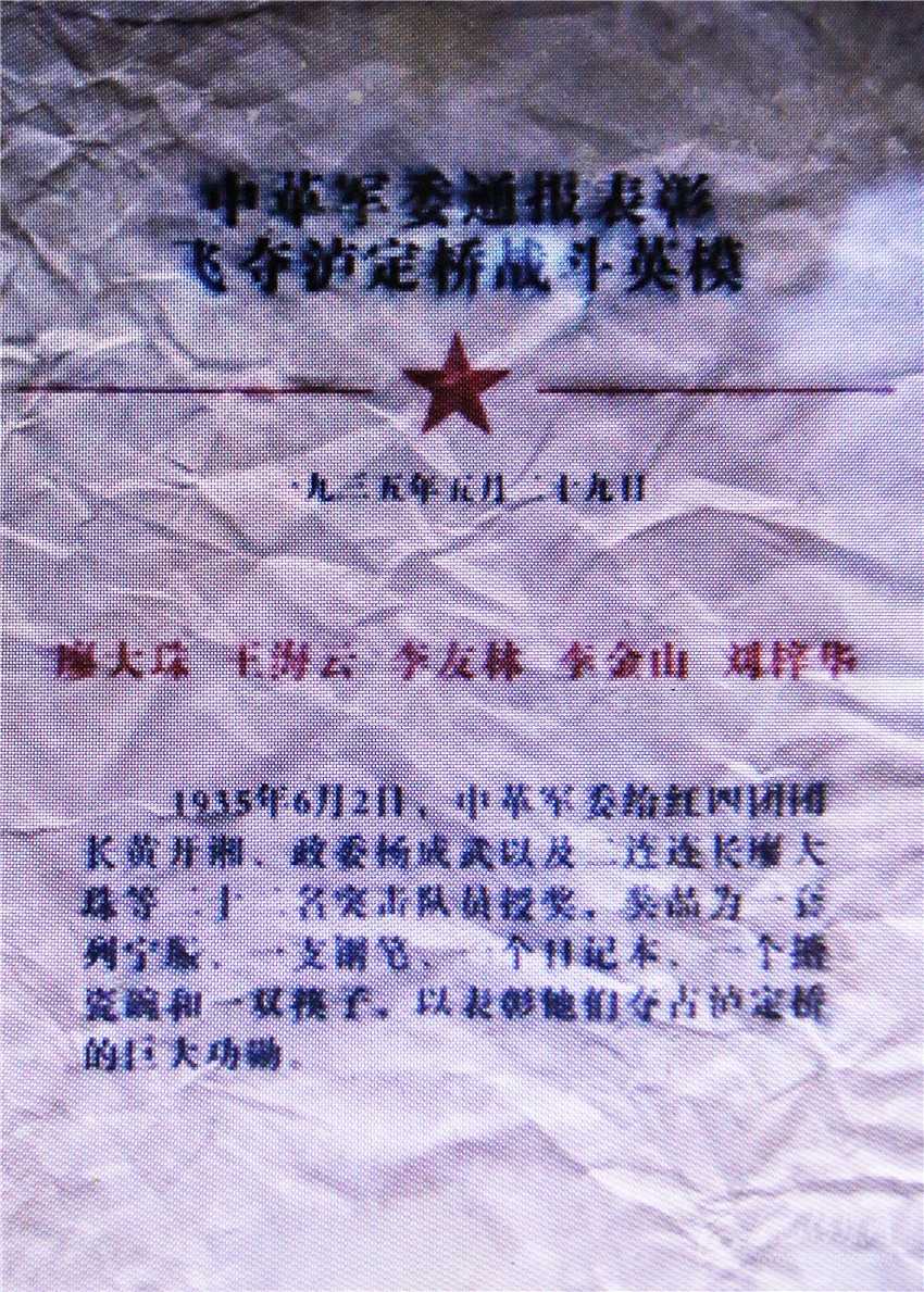 勝利了,對(duì)岸紅旗插上了,飛奪瀘定橋的22位勇士完成了偉大壯舉,為紅軍主力順利渡過瀘定橋創(chuàng)造了條件,寫下了長(zhǎng)征途中光輝的一頁(yè)。為表彰勇士,激勵(lì)戰(zhàn)士,中革軍委授予了18位勇士飛奪瀘定橋戰(zhàn)斗英模稱號(hào),并發(fā)放了一套列寧服、一支鋼筆、一本日記本、一只搪瓷碗和一雙筷子,以表彰勇士們奪占瀘定橋的巨大功勛。據(jù)父親說,他到延安抗大學(xué)習(xí)時(shí),這只鋼筆每天都陪伴著他,不僅用來寫字,也是對(duì)飛奪瀘定橋戰(zhàn)役的回憶,是他一輩子珍藏的信物。