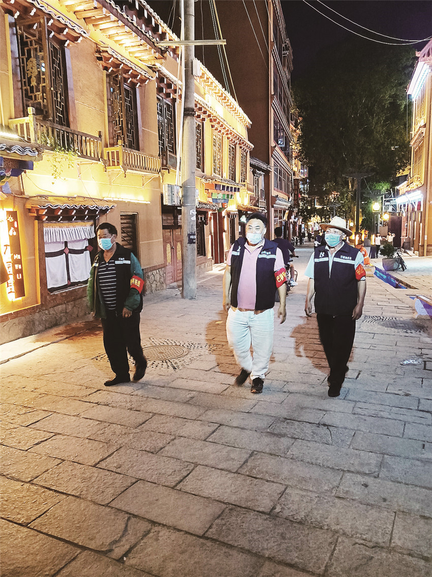巴塘縣網(wǎng)格員夏孟云和同事們開(kāi)展夜間巡邏。
