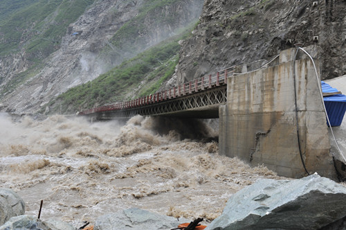 6月29日,恰逢周末,但在該公司的防汛指揮中心已是繁忙緊張氣氛,防汛值班員雖已熬紅了雙眼,緊盯著監(jiān)視屏并時刻保持與前方的聯(lián)系;7時23分,該公司副總經(jīng)理杜三林,長河壩工程部、安全環(huán)保部相關(guān)負(fù)責(zé)人來到了指揮中心;8時,流量逼近4170立方米每秒;10時,流量超過4200立方米每秒,已超過該工程自2010年開工以來最大流量,整個指揮中心的氣氛變得隨之凝重起來;10時30分至11時,指揮中心接連收到施工單位電話險情報告:此時此刻,長河壩工程初期導(dǎo)流洞水勢兇猛,導(dǎo)流洞出口橋0號橋臺回填料淘刷嚴(yán)重,1號橋墩發(fā)生傾斜,橋梁隨時有傾覆的可能,將會危及下游圍堰高程最低的中水十四局、中水五局營地的安全,更將會危及到300余名員工的人身安全;金湯河突發(fā)特大洪水,沖垮了通往金湯土料場的場內(nèi)公路,沿線山體已發(fā)生了小型泥石流,土料場通訊、交通已全部中斷,急需救援;持續(xù)降雨引發(fā)響水溝泥石流,3萬余立方米泥石流堆積物順溝而下,沖垮了響水溝石料場的鋼橋,并堵塞了場內(nèi)12號路1號隧道。必須馬上清運疏通,否則,響水溝再發(fā)泥石流,長河壩上游圍堰和大壩填筑工作面將直接面臨泥石流堆積物的直接沖擊,險情萬分緊急!