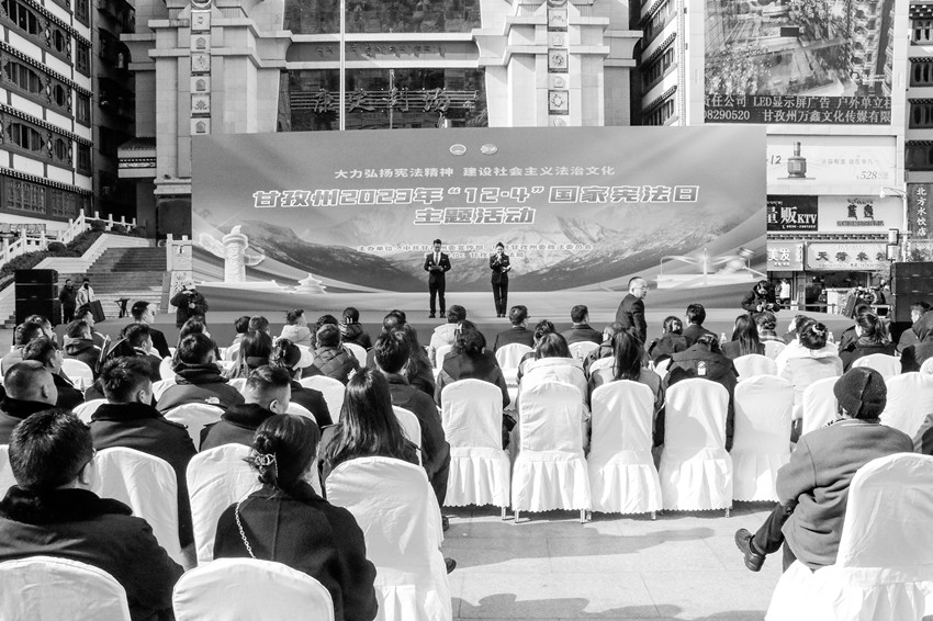本網訊 在第十個國家憲法日之際,12月1日下午,由州委宣傳部、州委政法委主辦,州司法局承辦的“甘孜州2023 年‘12·4’國家憲法日宣傳活動”在康定市情歌廣場舉行。