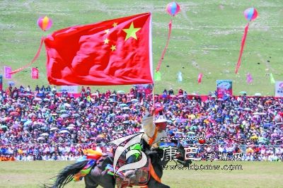 7月25日,第八屆康巴文化藝術節(jié)在玉樹藏族自治州開幕。數名參加開幕式的藏族老鄉(xiāng)高舉鮮艷的五星紅旗策馬狂奔,風馳電掣,跨越扎西科賽馬場,一瞬間,歡呼聲震耳欲聾,開幕式進入高潮。