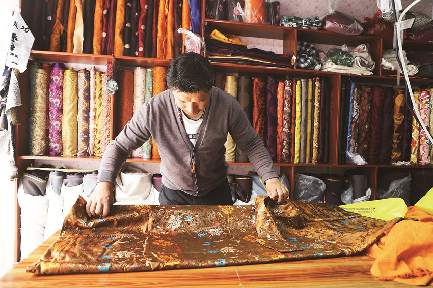 “傳統(tǒng)藏裝需要手工制作,青年、中年、老年人的款式各不一樣,料子也很有講究,還有裝飾也很重要……”說(shuō)起登龍服飾,扎西澤仁神采飛揚(yáng),不時(shí)發(fā)出爽朗的笑聲,他說(shuō),“一般簡(jiǎn)單的服裝制作僅需半天,復(fù)雜一些的要兩三天,價(jià)格從幾百元到幾千元不等?,F(xiàn)在縣城的商店生意很好,每天都能接到很多訂單,在登龍鄉(xiāng)的鋪?zhàn)咏唤o徒弟打理也完全沒(méi)有問(wèn)題。”