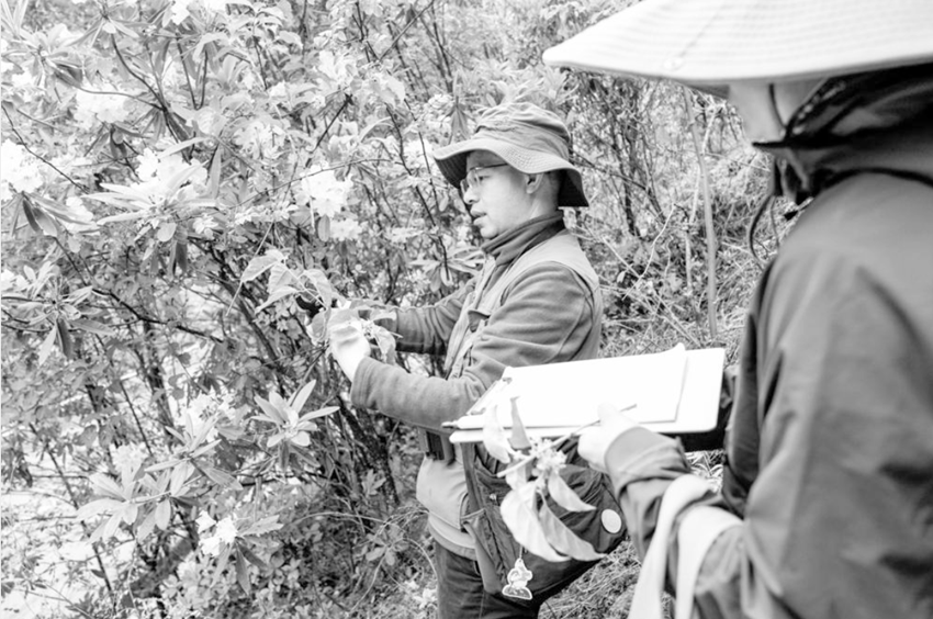 回到山腳,張遠彬正在打開植物“盲盒”?!斑@里海拔差別大,杜鵑的種類特別多,這是以前沒有記錄到的。”張遠彬直呼“驚喜”,邊用手機拍下形態(tài),邊口述特征讓一旁的助手記錄。