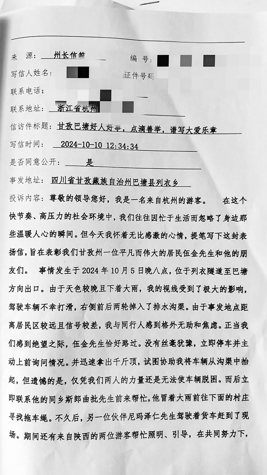 一封感謝信,從杭州的網(wǎng)端出發(fā),抵達(dá)“州長信箱”,再轉(zhuǎn)送到巴塘,跨越千里,情意綿長,引出一段感人至深的好人好事。“尊敬的領(lǐng)導(dǎo)您好,我是一名來自杭州的游客。今天我懷著無比感激的心情,提筆寫下這封表揚(yáng)信,旨在表彰我們甘孜州一位平凡而偉大的居民伍金先生和他的朋友們……”