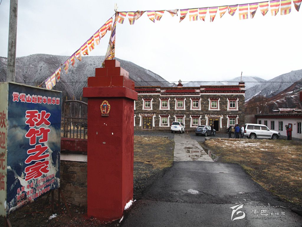 在距鄉(xiāng)政府不遠的營九路邊上,有一個“貢嘎山越野車俱樂部·秋竹之家”的燈箱廣告。在雪山的映襯下,這個不大的燈箱廣告顯得格外引人注目。步入“秋竹之家”的大門,進入眼簾的是一幢民族風格濃郁的建筑,黑白紅三色相間的墻面,還沒有吐綠的院壩,所有的一切,都讓記者看不出這幢建筑與普通民居有什么不同的地方。