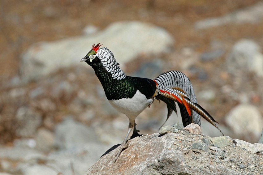 白腹錦雞(學(xué)名:Chrysolophus amherstiae):藏語(yǔ)譯音:甲嚇破呷妞仁 別名:銅雞、寬寬雞 國(guó)家II級(jí)保護(hù)動(dòng)物,見于瀘定、康定、丹巴、九龍等。 雄鳥全長(zhǎng)約140厘米,雌鳥約60厘米。雄鳥頭頂、背、胸為金屬翠綠色;羽冠紫紅色;后頸披肩羽白色,具黑色羽緣;下背棕色,腰轉(zhuǎn)朱紅色。飛羽暗褐色。尾羽長(zhǎng),有黑白相間的云狀斑紋。腹部白色。嘴和腳藍(lán)灰色。雌鳥上體及尾大部棕?