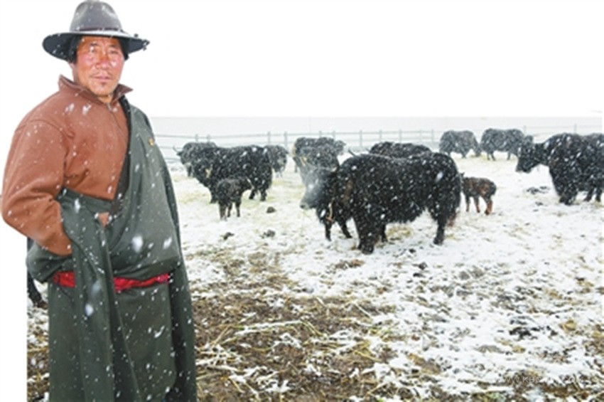 5月8日,甘孜縣達(dá)通瑪片區(qū)大雪飛揚(yáng)。在茶扎鄉(xiāng)銀多村集體牧場(chǎng),放養(yǎng)人員格絨正在給上百頭牦牛喂草料,他喜滋滋地說(shuō),通過(guò)牧民儲(chǔ)備和農(nóng)牧農(nóng)村局提供草料的方式,牦??梢园踩^(guò)冬。銀多村現(xiàn)代化集體牧場(chǎng)合作社成立一年多的時(shí)間,共出欄牦牛16頭,總收益67380元,除去20%預(yù)留金,村民有了一定的收入,而作為放牧人員,他管理了52頭牦牛,一年有1.2萬(wàn)元的收入。