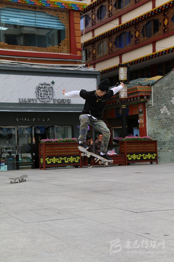6月22日,世界滑板日,康定市情歌廣場,一群滑板少年舉著“GOTTA’318”大旗,正在演繹精彩。他們時(shí)而團(tuán)隊(duì)作業(yè),時(shí)而單兵作戰(zhàn),時(shí)而爭相競技,時(shí)而相互逗樂。當(dāng)他們舞動(dòng)旗幟,蛇形而行,呼嘯而來,你會(huì)感受到蓬勃的青春氣息撲面而來;當(dāng)他們帶板直上滑桿,倏忽而過時(shí),你會(huì)在那一剎那感到記憶一陣空白,然后發(fā)出一聲驚嘆;當(dāng)他們瞬間起跳,在空中360度轉(zhuǎn)體,然后像雄鷹一樣翱翔時(shí),你會(huì)感覺歲月易老,對青春只有追憶;而當(dāng)他們競技“爭高”“望遠(yuǎn)”時(shí),你會(huì)感受到那鍥而不舍的奮斗精神充盈你的脈管……